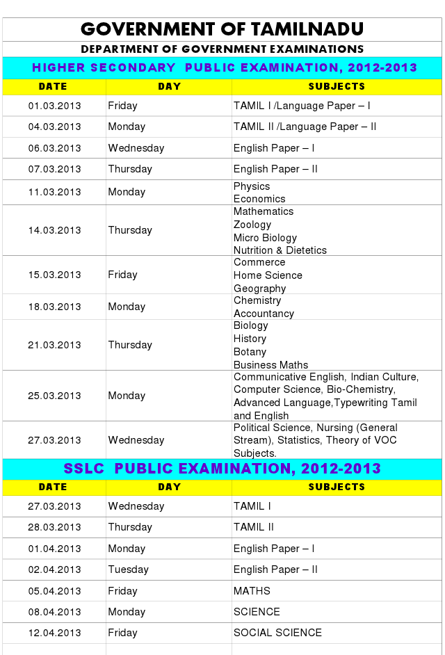 Tamilnadu Department of Government Examinations (TNDGE), Chennai Very Shortly release SSLC Annual Exam Time Table 2013. Every Year in the month of March annual exams conducted. Lakh of Students study SSLC in the State. Till Now thers is no official announcement on Exam Date... But Very Shortly Announce Time Table.. We provide immediate release of Exam Schedule 2013.