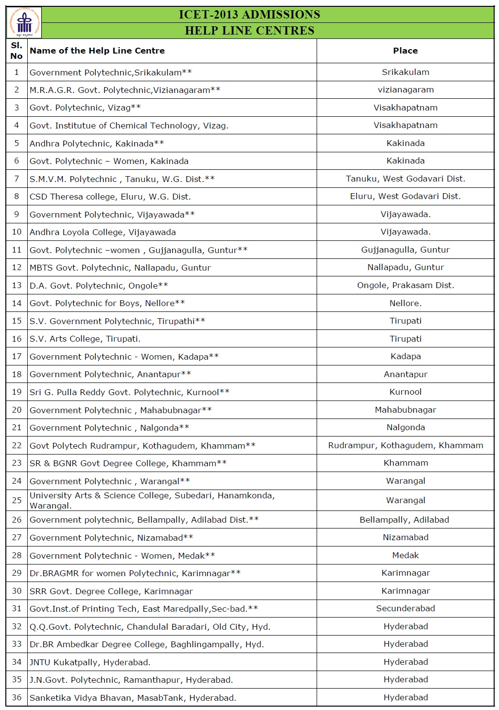 | ICET 2013 Help Line Centres |