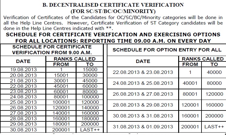 | EAMCET 2013 Centralised Certificate Verification Schedule |