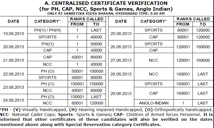 Click on the Below EAMCET 2013 Centralised Certificate Verification Schedule to view in Big Size :