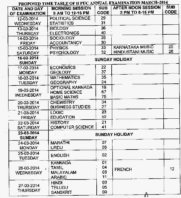 The Department of Pre University Education (PUE), Government of Karnataka is announced the casual time table for Karnataka 2nd PUC Board Exams 2014, which were to be conducted in the month of March, 2014. This Time Table is only the Draft Time Table after receiving any objections in the prescribed time table before 11-11-2013 the final time table will be released.